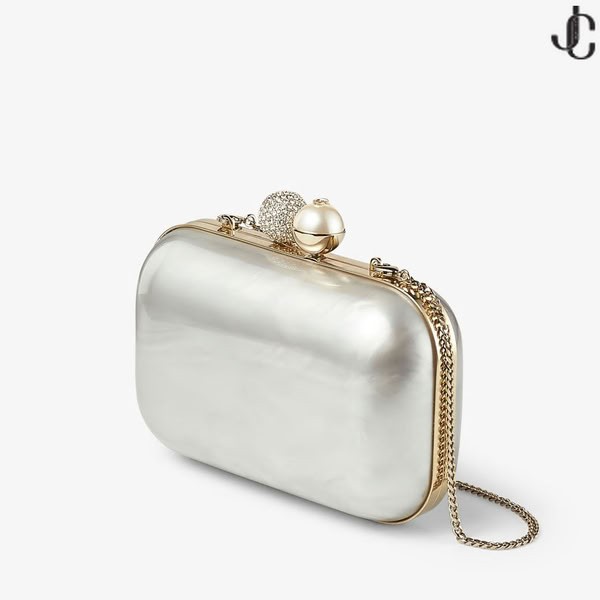 Našich Cloud spojka je okouzlující kus slonoviny, perleti. Chytře vytvořený, aby se vešly přirozeně v ruce, tento kompaktní minaudiere je nádherně strukturované, s odnímatelnou řetězce popruh a nabízí prostorný interiér pro všechny vaše dne nebo v noci essentials. Nadčasový kousek, doplněný míč spona zdobená s perlami a krystaly.