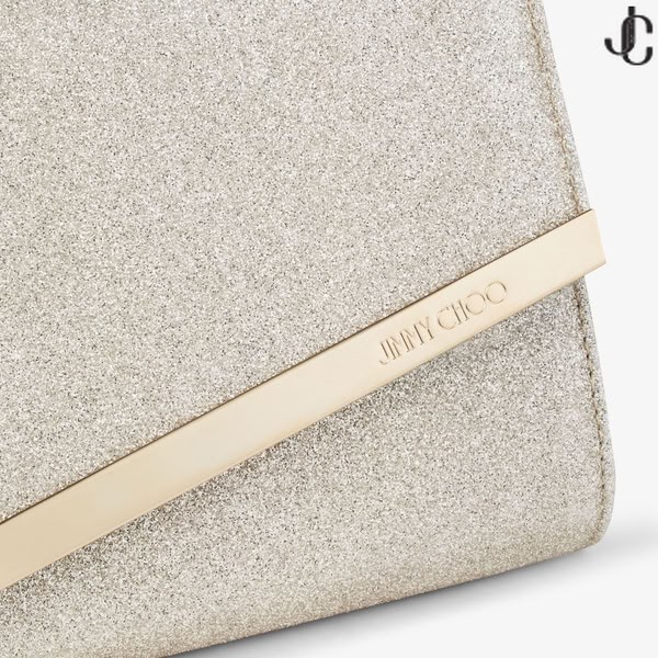 The Emmie clutch bag in platinum ice dusty glitter has a clean and modern raw edge construction. Designed in Italy, this ultimate evening clutch boasts a Jimmy Choo engraved magnetic snap button closure on the front panel. The detachable chain adds freedom and versatility, so wear yours full length or carried in hand.