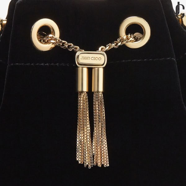 Slående og erklæring, den ikoniske BON BON tasken er lavet i sort fløjl. Lavet i Italien, vores signatur stil er præsenteret med en kæde, snor fastgørelse og er færdig med en guld metal armbånd top håndtag.