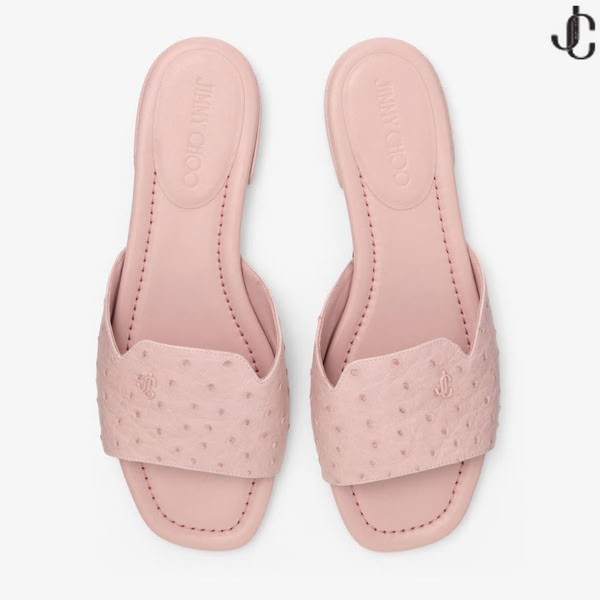 A sleek silhouette, the Dina flat is a modern low-heel style crafted from ostrich leather. It is designed with a square toe and complemented by a our signature Jimmy Choo monogram.