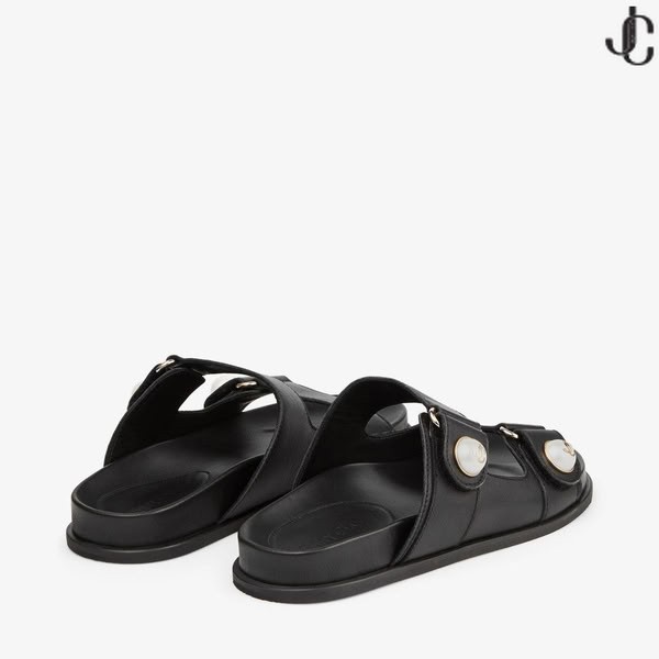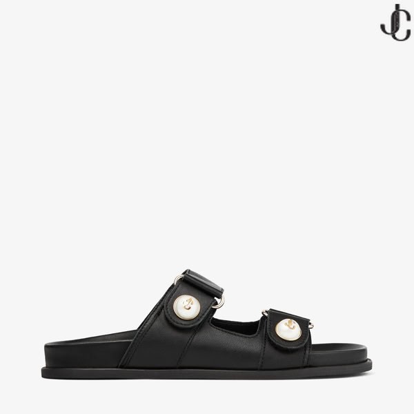 FAYENCE SANDAL Black Leather Flat Sandals with Pearl Embellishment Summer Collection