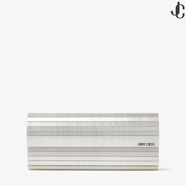 SWEETIE in ivory is a chic and easy-to-wear must-have this season. Our hard cased clutch is constructed from mother of pearl horizontal ribbed panelling, which makes for a dazzling faceted effect. It features a long chain strap, so can be worn on the shoulder or held in hand, and is finished with an internal side slit pocket and engraved Jimmy Choo leather emblem.