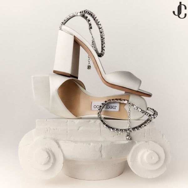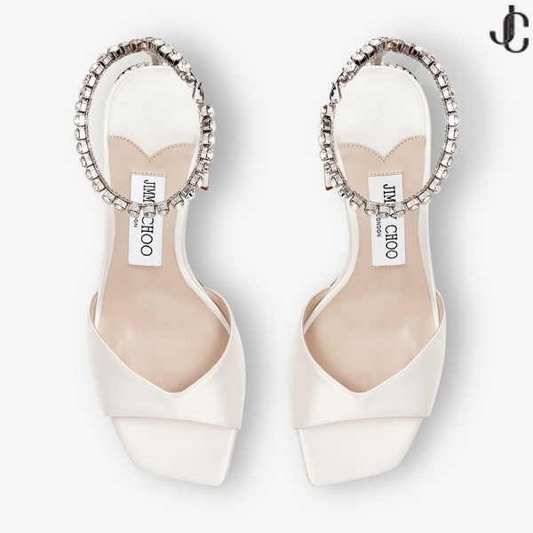 - Saeda Sandal 85 Ivory Satin Block Heel Sandals with Crystal Chain