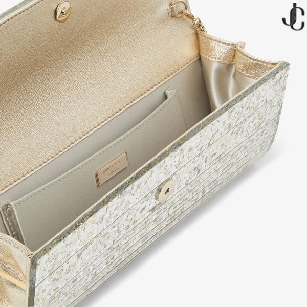 Chic, sofaisticiúla agus éasca a chaitheamh, an Sweetie mála clutch i champane garbh glitter aicrileach ní mór a bheith mhír séasúr seo. Déanta san Iodáil, seo ar fad crua cased clutch tógtha cothrománach iomaireach uv painéil, a dhéanamh le haghaidh dazzling ilghnéitheach éifeacht. Tá sé críochnaithe le inmheánach taobh slit treoir le greanta Jimmy Choo leathar plaic.