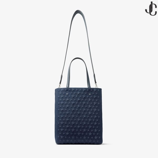 ardaithe riachtanach do do laethúil capsule, an Lenny tote tá crafted ó cabhraithe denim agus maisithe le réaltaí. Tá sé comhlánaithe ag silver crua-earraí agus ár síniú lógó.