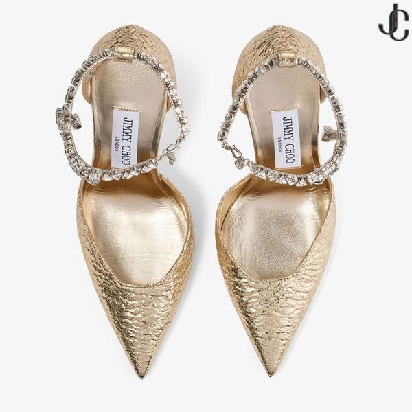 An Stevie caidéil dhéanann ráiteas le brúite mhiotalacha uachtair comhlánaithe ag anklet criostail. Seo le fios scáthchruth tá sé deartha le flattering V-ghearradh vamp agus dealbhaithe súil.
