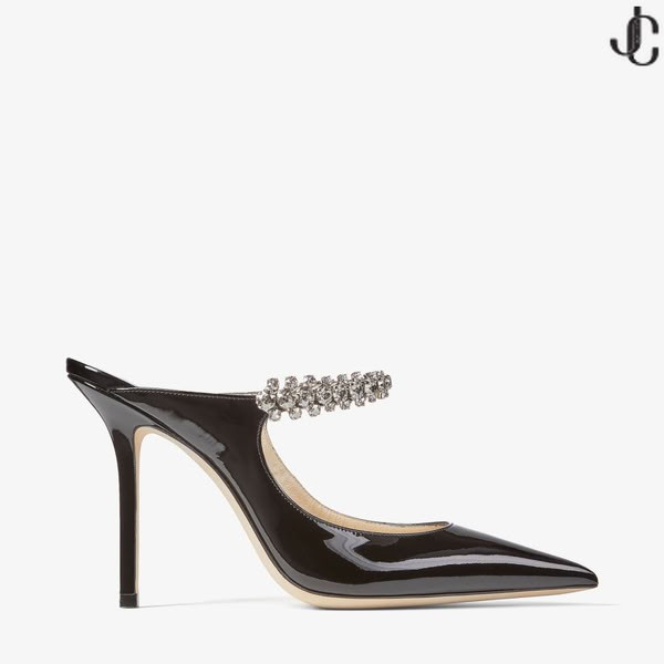 BING od crne lakirane kože - to je moderno i stilski sobe. Lijep dizajn bez spajala im daje prepoznatljiv stil i naglašava efekt ekstenzije nogu zahvaljujući каблуку visine 100 mm Model s remenom u obliku kristala na vrhu stopala za davanje glamura u kombinaciji s malim crnim haljina za stvaranje spektakularne slike.