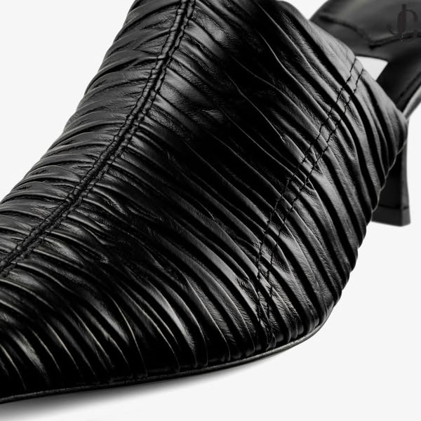 Lotta mule naglašavaju klasična silueta zahvaljujući элегантному modernom dizajnu, obavljanjem od kože s рюшами. Ovaj model sa otvorenim leđima će postati univerzalna obuća za vaše dnevne ili večernje garderobe.