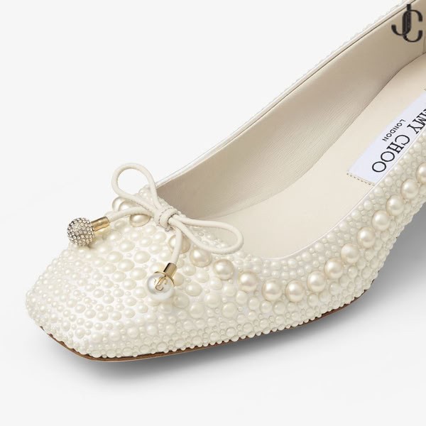 Az Elme egy klasszikus balerina sziluett emelkedett egy ultra-hordozható alacsony sarok. Kialakított gyöngy-díszített szatén, azt egészíti ki egy gyöngy, pedig kristály-díszített íj.