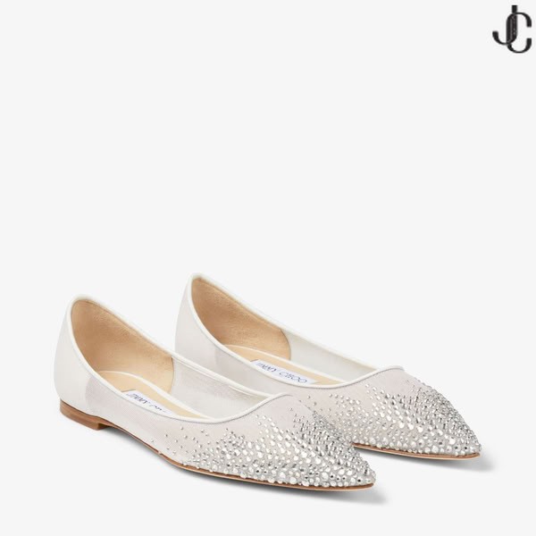Amore Flat Flache Schuhe aus kristallverziertem Netzstoff in Weiß für die Braut