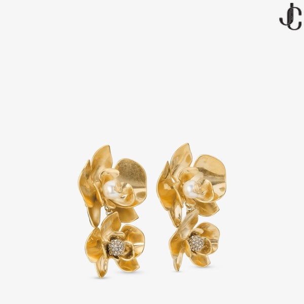 PETAL DUBBELE OORBEL Goud-Finish Oorbellen met Kristal en Parel Versiering Nieuwe Collectie