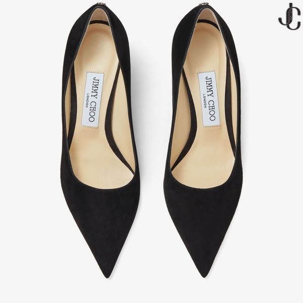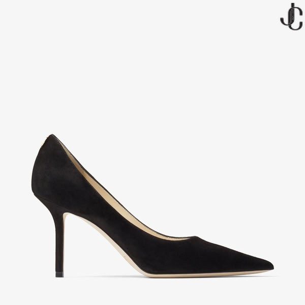 LOVE z czarnej, oleistej zamszu - wcielenie elegancji. Obcasy mamy obcięte powyżej, co zapewnia większy zasięg stopy, a u tej pary spektakularny pointy. Są one uzupełnione delikatnym obcasem 85 mm i złote logo JC z tyłu.