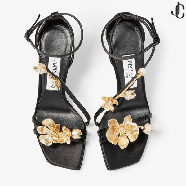 ZEA 95 Preto de Cetim Sandálias com Flores de Metal Nova Coleção