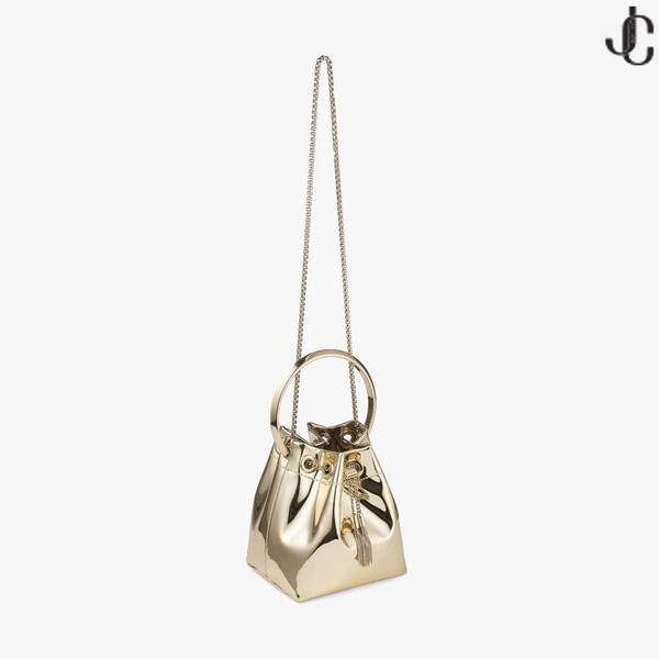 Du-te pentru aur cu iconic BON BON Mini-geantă de mână. Artizanale de aur stralucitoare oglinda tesatura, semnătura noastră oferă un stil cu un lanț de cordon fixare cu ciucuri și este terminat cu o brățară de metal mâner de top. Purta în mână sau să poarte cross-body, folosind lanț de curea.
