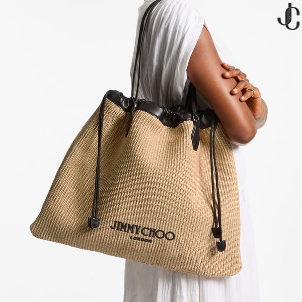 Šnúrkou Tote L Prírodné Mäkké Raffia Tote s Hladkými Teľa Kožené s Jimmy Choo Logo