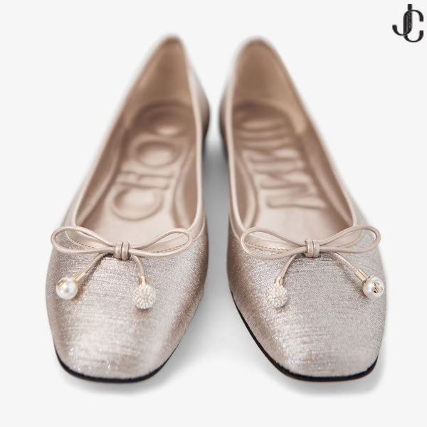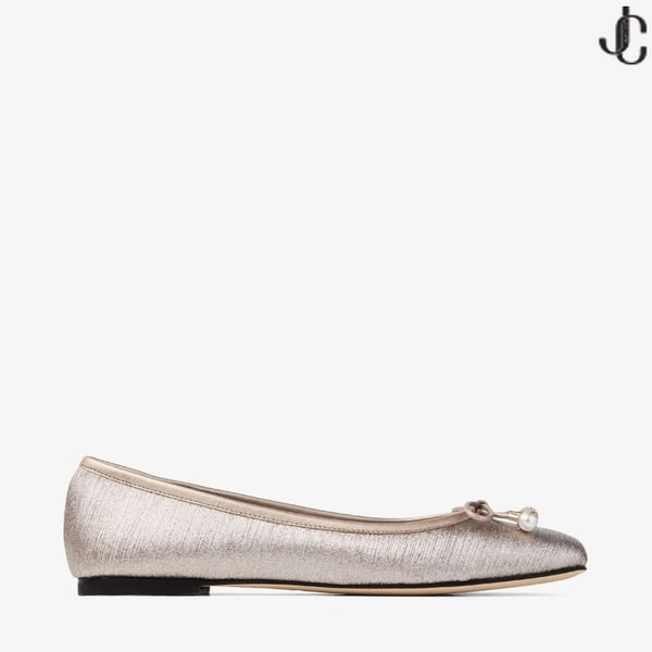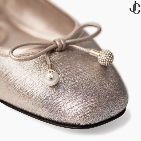 Elme, gösterişli parıltılı kumaştan hazırlanmış klasik bir tarzdır. Bu zamansız balerin ayakkabısı, inci ve kristal süslemeli bir fiyonk ve imzalı Jimmy Choo amblemi ile tamamlanan zahmetsizce zariftir.
