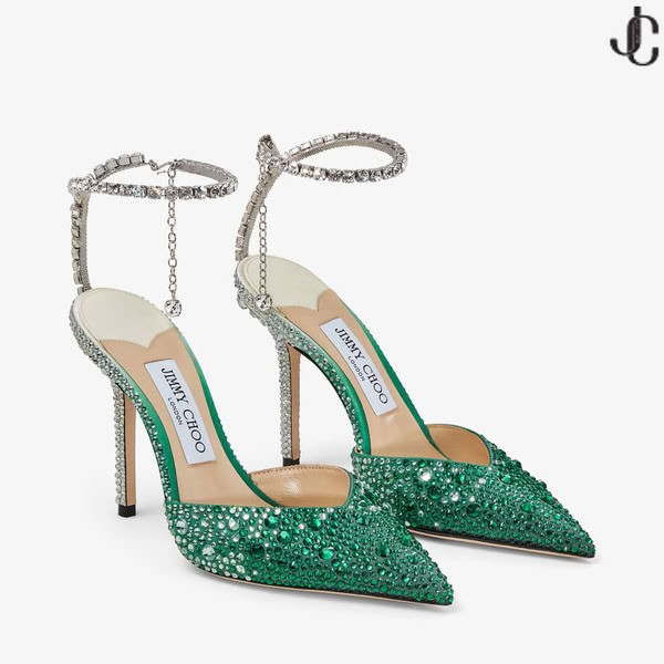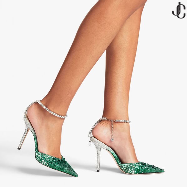 Ayakkabı ve mücevher arasındaki çizgiyi bulanıklaştıran saten'deki ikonik Saeda pompası tamamen düzeltme kristalleriyle süslenmiştir. Narin kristal halhalıyla ayırt edilir. Bu parlayan ifade, ayakkabının arkasına zarif bir şekilde asılan bir damla kristal içeren 40 ayrı ayrı uygulanmış zarif kristale sahiptir. Halhal, bacağını zahmetsizce uzatarak ayak bileğinin üzerine oturacak şekilde tasarlanmış ve üretilmiştir. Çarpıcı ve göz alıcı olan bu çift, 100 mm'lik ince topuklu bir topuk üzerine kuruludur.